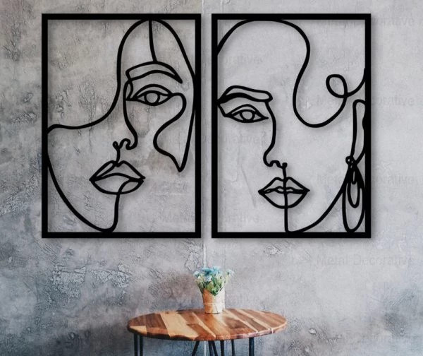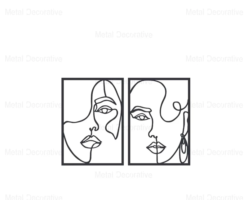 تابلوفلزی دو تکه چهره زن با پیچ و تاب موی سر جهت استفاده در محیط کافی شاپ یا مسکونی می باشد . این تابلو ها از ورق فلزی و توسط دستگاه برش لیزر تولید شده و سپس در کوره های رنگ با انواع رنگ های مشکی ، سفید و طلایی قابل تولید هستند . نصب این تابلو بسیار آسان می باشد و به راحتی با استفاده از دو عدد پیچ و رولپلاک سایز متوسط می توانید روی دیوار نصب کنید .