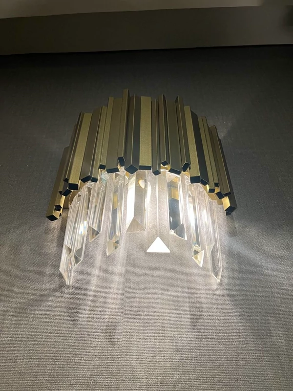 این محصول، یک اثر هنری خیرهکننده است که با طراحی ستونی و طبقات پلکانی، جلوهای از شکوه آرت دکو را به فضای شما میآورد. میلههای فلزی با پوشش طلایی/برنجی، بافتی گرم و مدرن ایجاد میکنند، در حالی که لایههای زیرین از منشورهای کریستالی تشکیل شدهاند تا نور را به صورت دراماتیک منعکس کنند.
