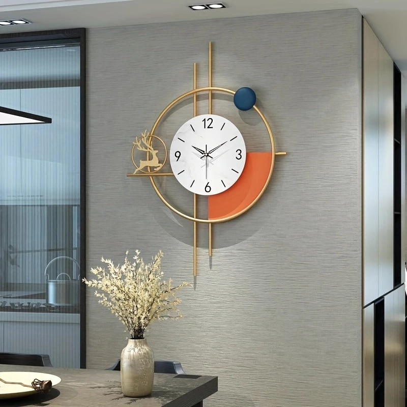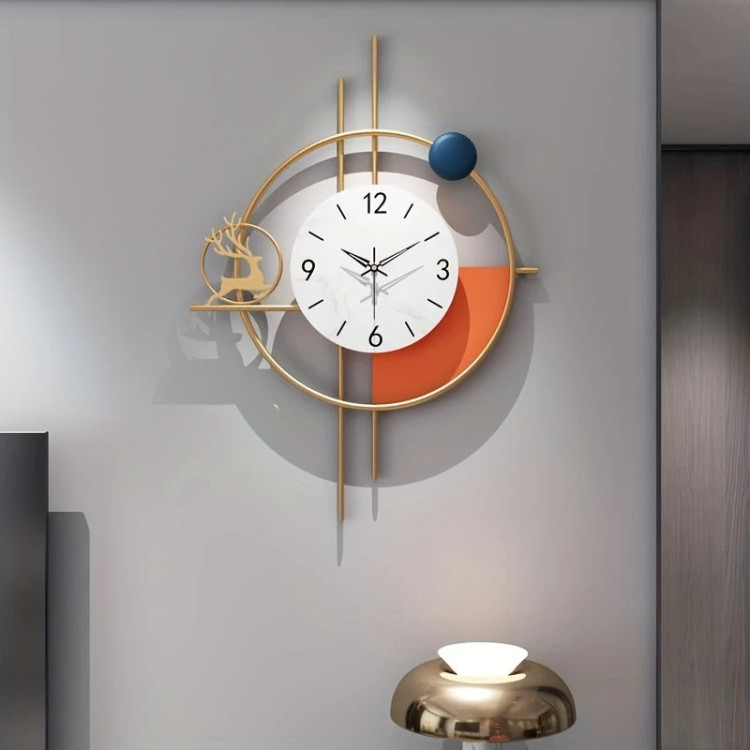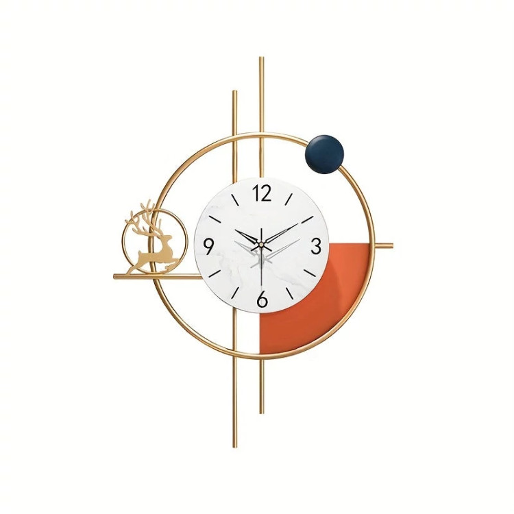 بخش اصلی ساعت: یک دایره نارنجی رنگ با اعداد یونانی ساده که خوانایی خوبی المانهای تزئینی: دایرههای توخالی طلایی، صفحه قهوهای تیره در پسزمینه و نماد کوچک یک گوزن در حال دویدن که حس طبیعت و ظرافت را اضافه کرده است.