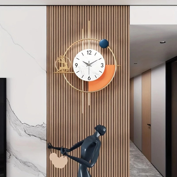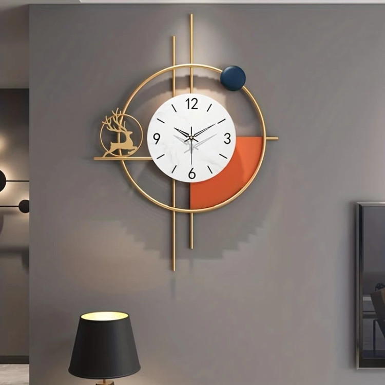 بخش اصلی ساعت: یک دایره نارنجی رنگ با اعداد یونانی ساده که خوانایی خوبی المانهای تزئینی: دایرههای توخالی طلایی، صفحه قهوهای تیره در پسزمینه و نماد کوچک یک گوزن در حال دویدن که حس طبیعت و ظرافت را اضافه کرده است.