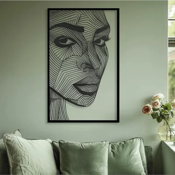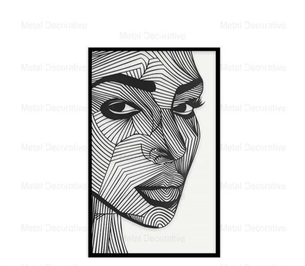 تابلو دکوراتیو دیواری مدرن چهره زن مناسب برای استفاده در دکوراسیون مسکونی یا محیط آرایشگاه می باشد. این تابلو ها از ورق فلزی و توسط دستگاه برش لیزر تولید شده و سپس در کوره های رنگ با انواع رنگ های مشکی ، سفید و طلایی قابل تولید هستند . نصب این تابلو بسیار آسان می باشد و به راحتی با استفاده از دو عدد پیچ و رولپلاک سایز متوسط می توانید روی دیوار نصب کنید .