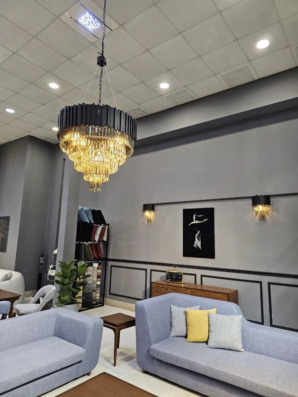 این محصول، یک اثر هنری خیرهکننده است که با طراحی ستونی و طبقات پلکانی، جلوهای از شکوه آرت دکو را به فضای شما میآورد. میلههای فلزی با پوشش طلایی/برنجی، بافتی گرم و مدرن ایجاد میکنند، در حالی که لایههای زیرین از منشورهای کریستالی تشکیل شدهاند تا نور را به صورت دراماتیک منعکس کنند.