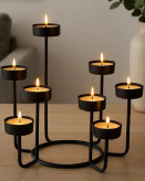 جاشمعی طلایی چند شاخه با شمع های سفید روشن، نور گرم و ملایمی را در فضای دنج و مدرن اتاق غذاخوری ایجاد کرده است. پایه های برنجی با ارتفاع های مختلف، جلوه ای هنری به میز چوبی بخشیده و فضایی آرام و دعوت کننده برای یک شب دلپذیر فراهم کرده است.