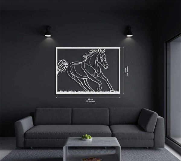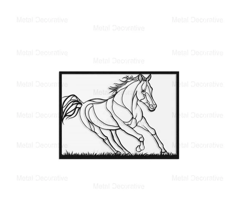 تابلو دکوراتیو اسب برای دفتر اداری یا محیط مسکونی می باشد. این تابلو ها از ورق فلزی و توسط دستگاه برش لیزر تولید شده و سپس در کوره های رنگ با انواع رنگ های مشکی ، سفید و طلایی قابل تولید هستند . نصب این تابلو بسیار آسان می باشد و به راحتی با استفاده از دو عدد پیچ و رولپلاک سایز متوسط می توانید روی دیوار نصب کنید
