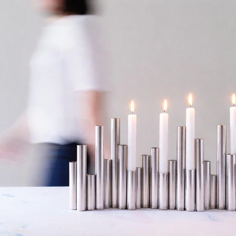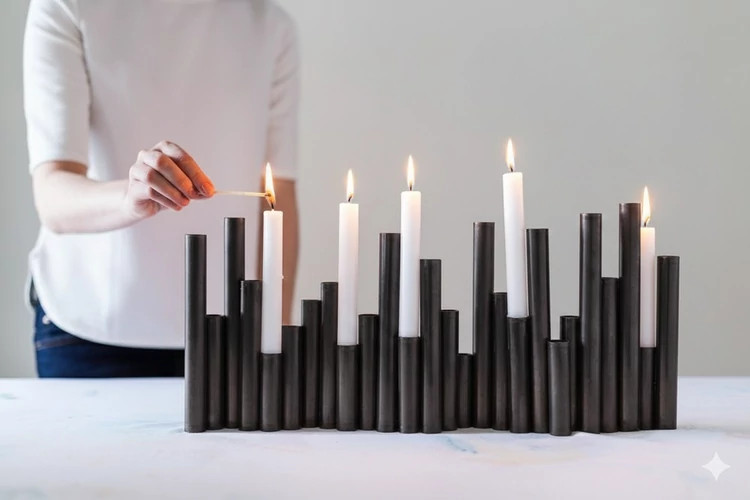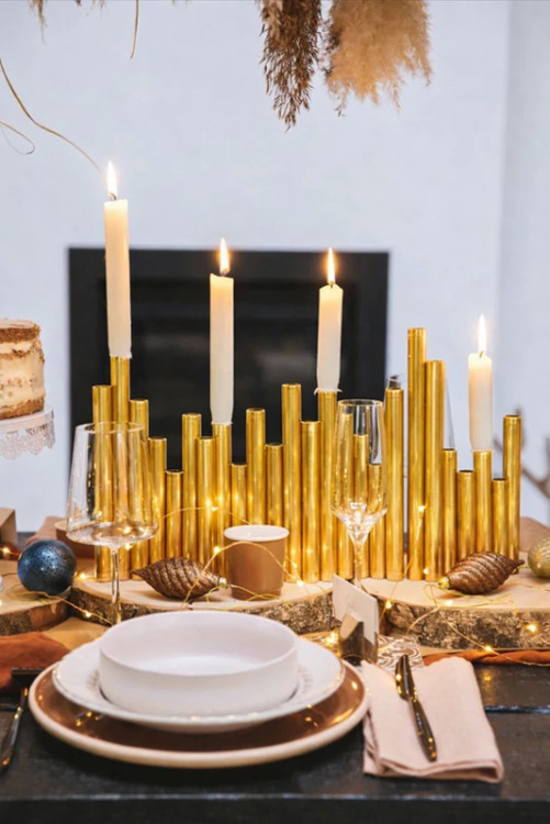 جاشمعی طلایی چند شاخه با شمع های سفید روشن، نور گرم و ملایمی را در فضای دنج و مدرن اتاق غذاخوری ایجاد کرده است. پایه های برنجی با ارتفاع های مختلف، جلوه ای هنری به میز چوبی بخشیده و فضایی آرام و دعوت کننده برای یک شب دلپذیر فراهم کرده است.