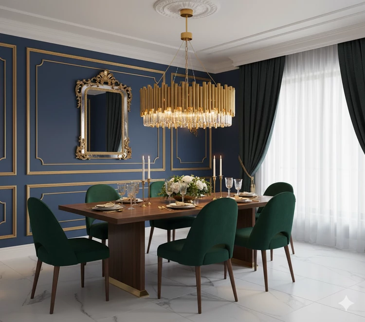 سالن غذاخوری رسمی: نصب بالای میز ناهارخوری گرد بزرگ.