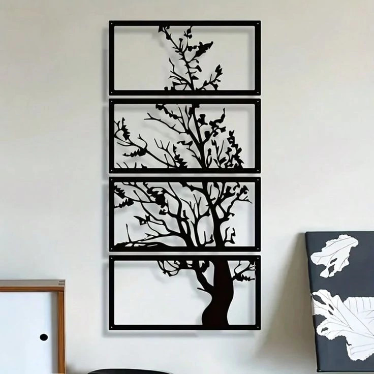 تابلو دکوراتیو دیواری مدرن مناسب برای استفاده در دکوراسیون مسکونی یا محیط آرایشگاه و کافه ها می باشد. این تابلو ها از ورق فلزی و توسط دستگاه برش لیزر تولید شده و سپس در کوره های رنگ با انواع رنگ های مشکی ، سفید و طلایی قابل تولید هستند . نصب این تابلو بسیار آسان می باشد و به راحتی با استفاده از دو عدد پیچ و رولپلاک سایز متوسط می توانید روی دیوار نصب کنید .
