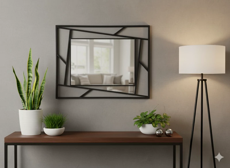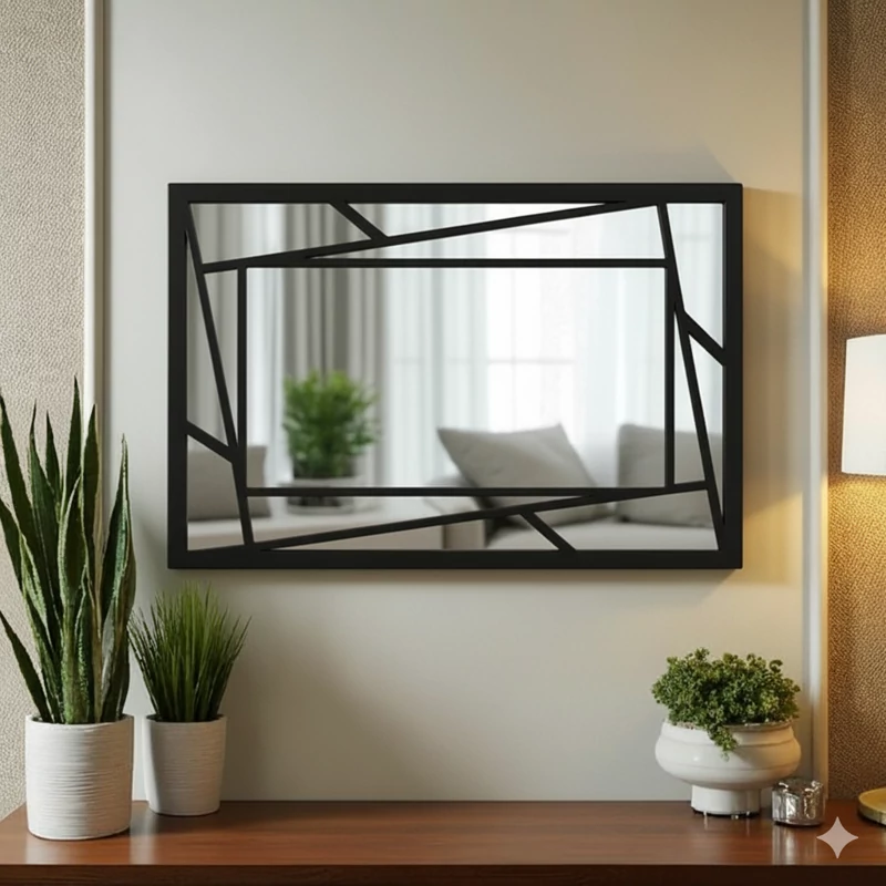 این آینه یک قطعه دکوراتیو بسیار جذاب و مدرن است که بیشتر از اینکه صرفاً یک آینه کاربردی باشد، حکم یک اثر هنری روی دیوار را دارد.