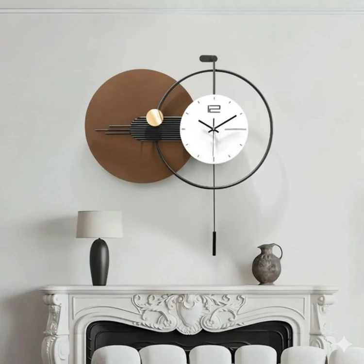 اگر به دنبال این هستید که فراتر از یک ساعت معمولی، یک اثر هنری دکوراتیو بر روی دیوار داشته باشید، این مدل با طراحی پاندولدار و لایههای رنگی گرم، بهترین انتخاب است. طراحی این ساعت به گونهای است که با ایجاد کنتراست بین صفحه سفید ساعت و پسزمینه دایرهای تیره، به نقطه کانون توجه در هر فضایی تبدیل میشود.